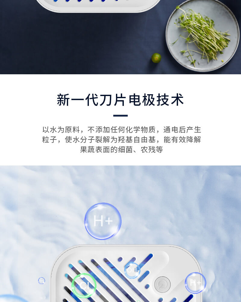 水在離子發(fā)生器的作用下分解成OH-和H+;分解的一部分OH-將農(nóng)藥和細菌細胞壁上的H+奪走并重組,形成無害物質;另一部分OH-和水中氯結合生成次氯酸,通過氧化反應降解殺滅細菌。